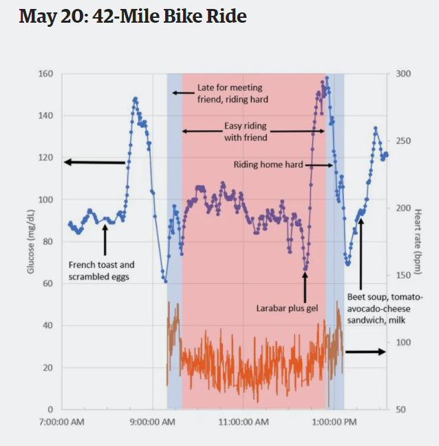 Am găsit acest clip unde am văzut un grafic glicemic în timp real obținut de un sportiv. real al unui sportiv. În clip, doi sportivi parcurg 140 de kilometri. Unul are voie să se alimenteze cu glucide, altul nu are voie să consume glucide. Scopul pentru care au filmat ei acest challenge este altul, să vadă când ciclistul fără mâncare ajunge la celebrul „zid” de efort. Dar pentru un diabetic ca mine, clipul este fascinant și oferă răspunsuri la multiple întrebări pe care le-am avut încă din copilărie. De exemplu…
